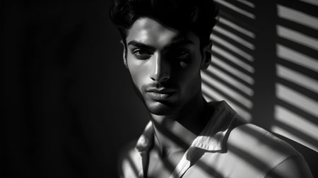 Portrait of a young man with shadows on his face. Black and white photo.