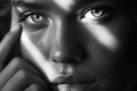 This stunning black and white portrait features a close-up of a young woman's face, showcasing her striking eyes and intense emotion. The play of light and shadow captures the beauty and complexity of human expression, creating a powerful and captivating image.