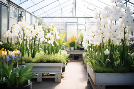 Blooming White Lilies Arranged in Rows Inside a Well-Lit Greenhouse