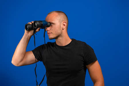 Young man over isolated blue wall and looking in the distance with binoculars. Exploration concept