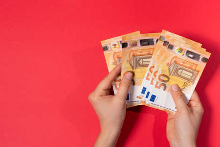 The man holds the money and counts the banknotes 50 euros on a red background. Banner for loans and loan money with place for text