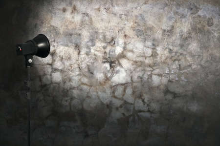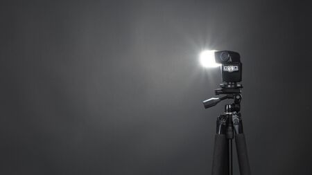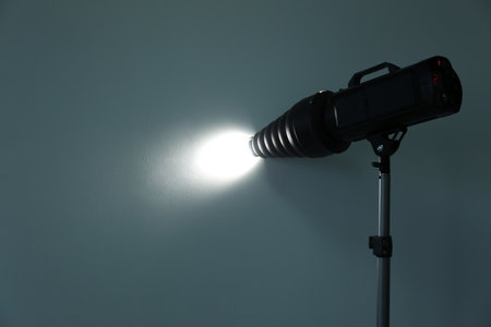studio assistant fix professional video light on adjustable light stand. Led lamp on tripod in photo studio. Photo and video lamp on embossed grey wall background. Close-up view