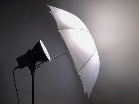 Photography set up. Professional photography studio flash light with reflective umbrella.