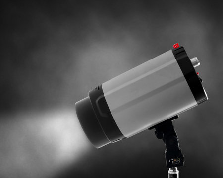 Photo studio strobe light flash bulb monoblock. Close up view of professional studio strobe flash lamp on black background. Jinbei. flash on. protective cap