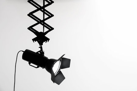 Professional lighting equipment hanging from ceiling in photo studio, space for text