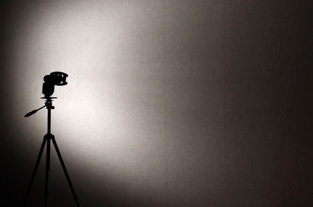 Black and white screen background in photography studio with light tripod and softbox modifier