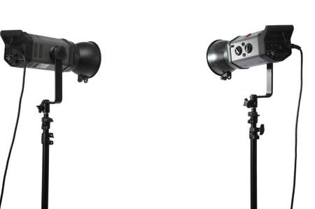 Studio light equipments for photo or film movie video. Light set for professional shooting studio background. LED Flood light and Spot light for video production studio. Setup include Barn door softbox.