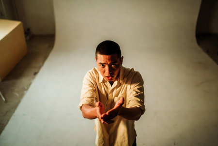 Afro american guy with his palms raised up