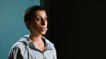 Confident woman chewing gum and making bubbles with a bubble gum flavor, playful silly person against blue background. Young funny person acting childish in studio.