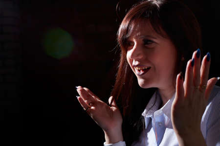 Emotional portrait of caucasian brunette girl or middle aged woman with long dark hair in blue shirt on black background and interesting light from flash in studio