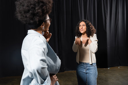 multiracial actress grimacing while rehearsing near blurred african american actress in theater