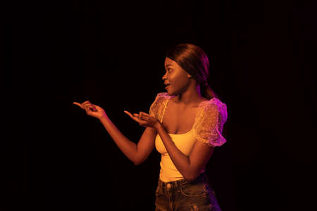 One young African beautiful girl isolated over dark background in mixed neon light.
