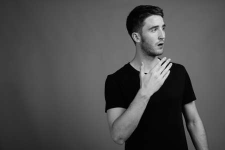 Portrait of young handsome man against gray background