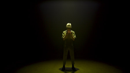 A tall, vertical (9:16) full-body shot of a solitary figure standing in a large, dark studio. The su
