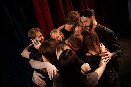 Embracing each other. Group of actors in dark colored clothes on rehearsal in the theater