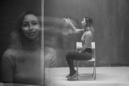 Close up emotional portrait of happy blonde woman. Monochrome, black and white. Motion blur and double exposure