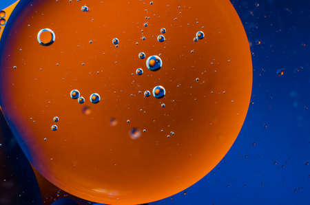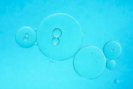 Oil and water bubbles on blue background. Abstract oil bubbles background.