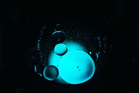 oil droplets from a mixture of water and olive oil illuminated with colored bulb with dark background