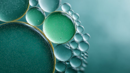 Oil and water solutions creating spherical bubbles and organic cell like structures, flowing with a mesmerizing macro view and an abstract liquid background
