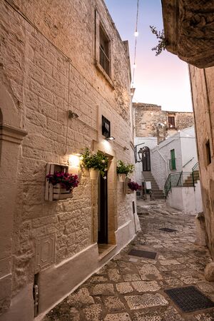 View of a typical alley of Ceglie Messapica (Italy) at sunset