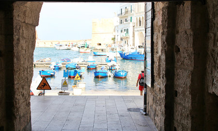 blue boats at the shore, the town of Monopoli, an Italian fishing town, passage to the sea shore under the buildings, man at the sea shore, boats parked in a bay