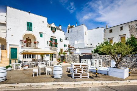 Narrow white street and restaurant tables in Locorotondo, region Puglia, Italy