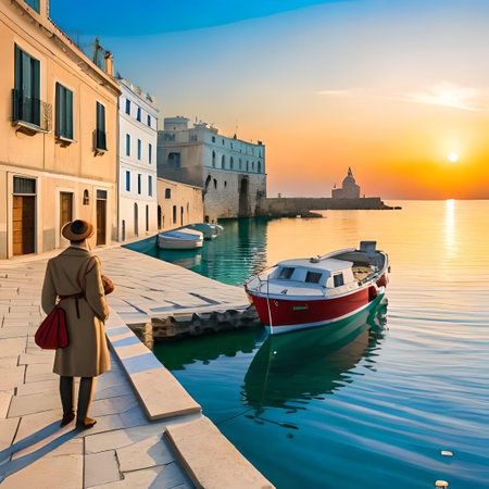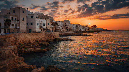 Generative AI : Aerial view of Monopoli old town at sunset along the Mediterranean Sea Bari Puglia Italy