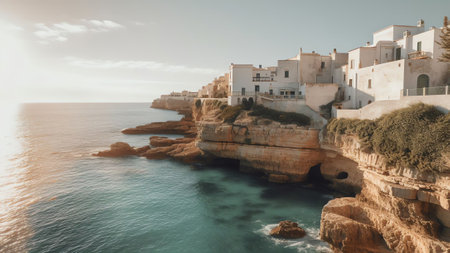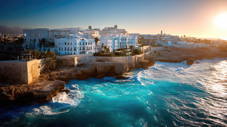 This image presents a coastal cityscape with white buildings positioned along a rocky coastline. Turquoise water meets the shore under a warm sunset. The photograph features natural lighting and a wide angle. Suitable for various uses, this image captures a scenic view of structures and nature.