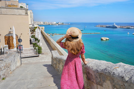 Holidays in Apulia, Italy. Tourist girl walking along the ancient walls of Otranto enjoying panorama of Otranto Bay in Salento, Italy.
