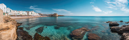 Gallipoli showcases its stunning beaches, historic castle, and colorful old town, with clear turquoise waters gently lapping at the shore under a bright sky.