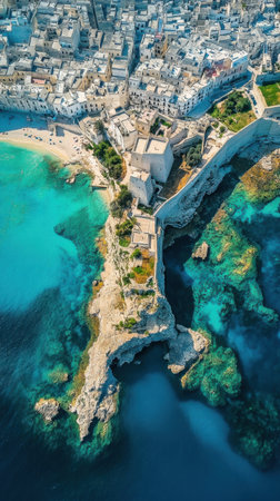 Generative AI : Aerial view of Polignano a Mare a small town along the coast facing the Mediterranean Sea Bari Puglia Italy
