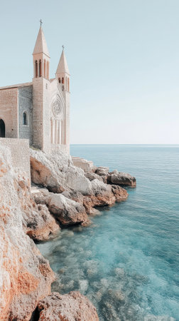 The image shows a charming historic church located on rugged cliffs, overlooking a calm sea. The tranquil water reflects the clear blue sky, creating a peaceful coastal atmosphere.