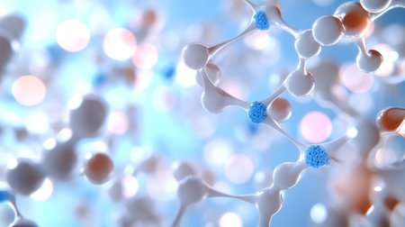 Intricate representation of a molecular structure featuring glowing particles. Ideal for illustrating concepts in science, chemistry, and technology.
