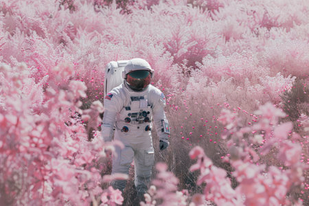 high-altitude view of astronaut floating over sea of blooming flowers, created with generative ai