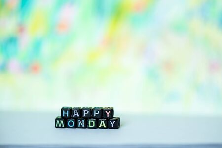 Happy Monday of blocks on white page open notebook on colorful blurred background
