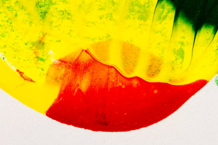 Macro shot of abstract vibrant acrylic art background. Multicolor light and bright texture. Fragment of artwork. Spots of acrylic paint. Modern contemporary art.
