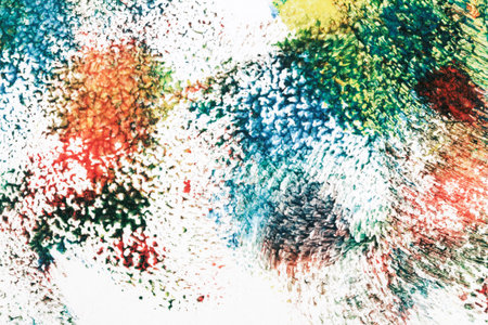Macro shot of abstract acrylic art background. Multicolor light and bright texture. Fragment of artwork. Spots of acrylic paint. Modern contemporary art.