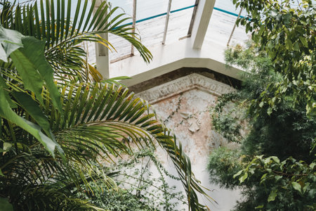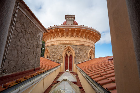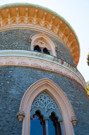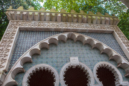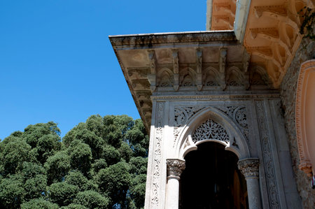 Sintra, Portugal - February 5, 2019: Exterior view of the Monserrate palace in Sintra, Portugal, on february 5, 2019. Detail of the facade with arabic themed decorations
