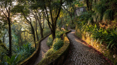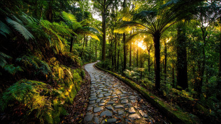A stone pathway curves through a vibrant, sun-drenched forest filled with lush foliage.
