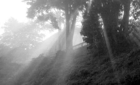 Ornate stone terrace of a historic building surrounded by lush green forest, arched window columns, and decorative railings, bathed in warm filtered sunlight in a serene setting