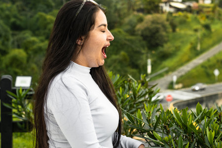 young latina woman, yawning in an outdoor park. very sleepy and tired.