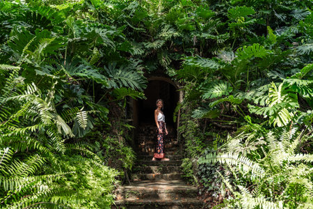 An ancient stone arch covered in climbing vines, leading to a hidden corner of Monserrate Park.