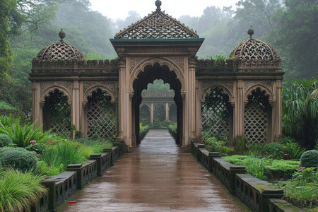 Explore a serene garden path that leads to a charming pavilion surrounded by vibrant flowers and stunning greenery, perfect for relaxation and contemplation.