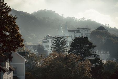 View of the historic town of Sintra, Portugal, featuring iconic chimneys of the National Palace, lush greenery, and misty mountains in a tranquil autumn morning atmosphere