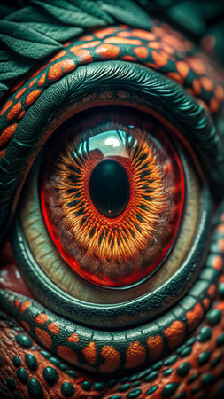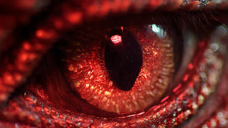 A close-up of a dragon's eye with a red iris and vertical pupil