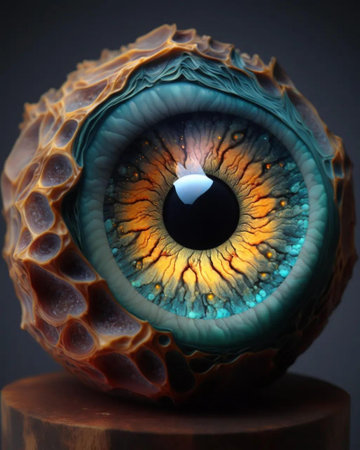 alien object on desert with eyes and mushrooms. surreal abstract landscape background. Generative and illustration.