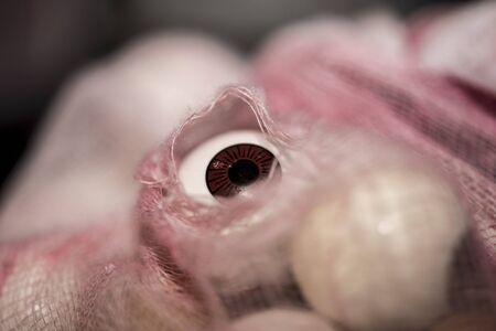 Red eyes and white bandages on black. Background of the face of the mummy for Halloween for the design of invitations, posters and so on.