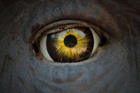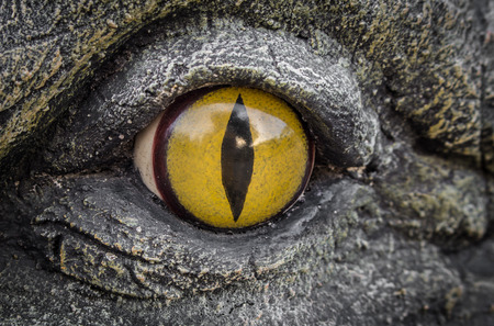 Closeup yellow eye of the dinosaurs with terrifying. Dinosaur hunters are staring with horrible yellow eye. Dinosaur eye.