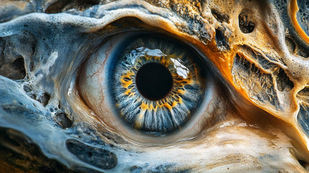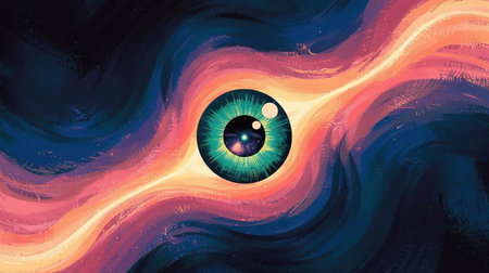 Vibrant eye illustration set against a swirling cosmic background, blending abstract art with imaginative design, creating a captivating visual experience