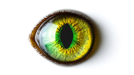Green with yellow eye of a girl, in which the camera lens is reflected, macro photo